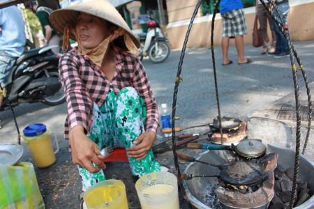 左の写真はお菓子を焼いて売っている人、焼きたてのお菓子がとてもおいしかったです。