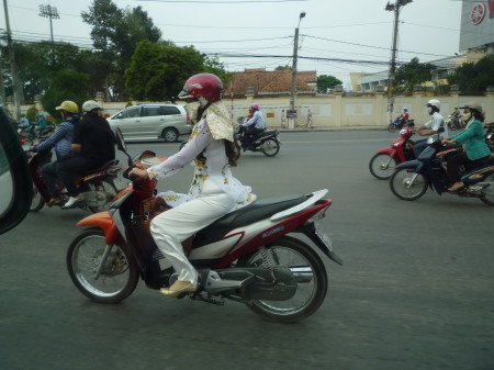 伝統衣装のアオザイを着た女性も、マスクをかぶってバイクにまたがります。